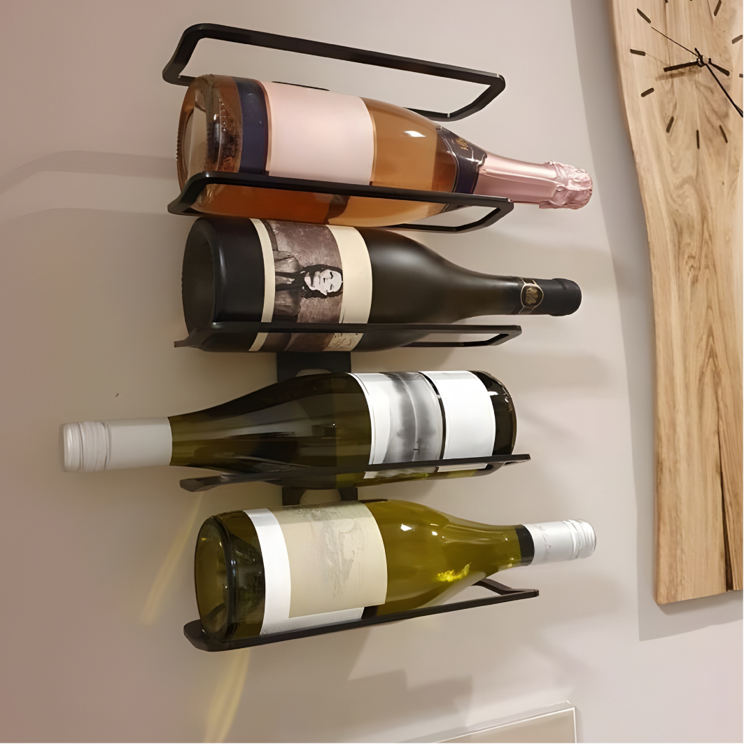 This wall-mounted wine rack firmly supports the bottles and displays the labels clearly and adds a touch of modern class to your living space. The rack holds up to 5 bottles of wine. Takes most sizes of 750cl to 1000cl bottles. Made in the UK from solid metal and has a powder-coated finish, making it extremely durable and easy to maintain. It is an ideal choice to make a gift for your wine-loving friends.
